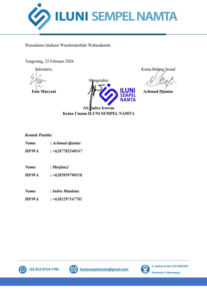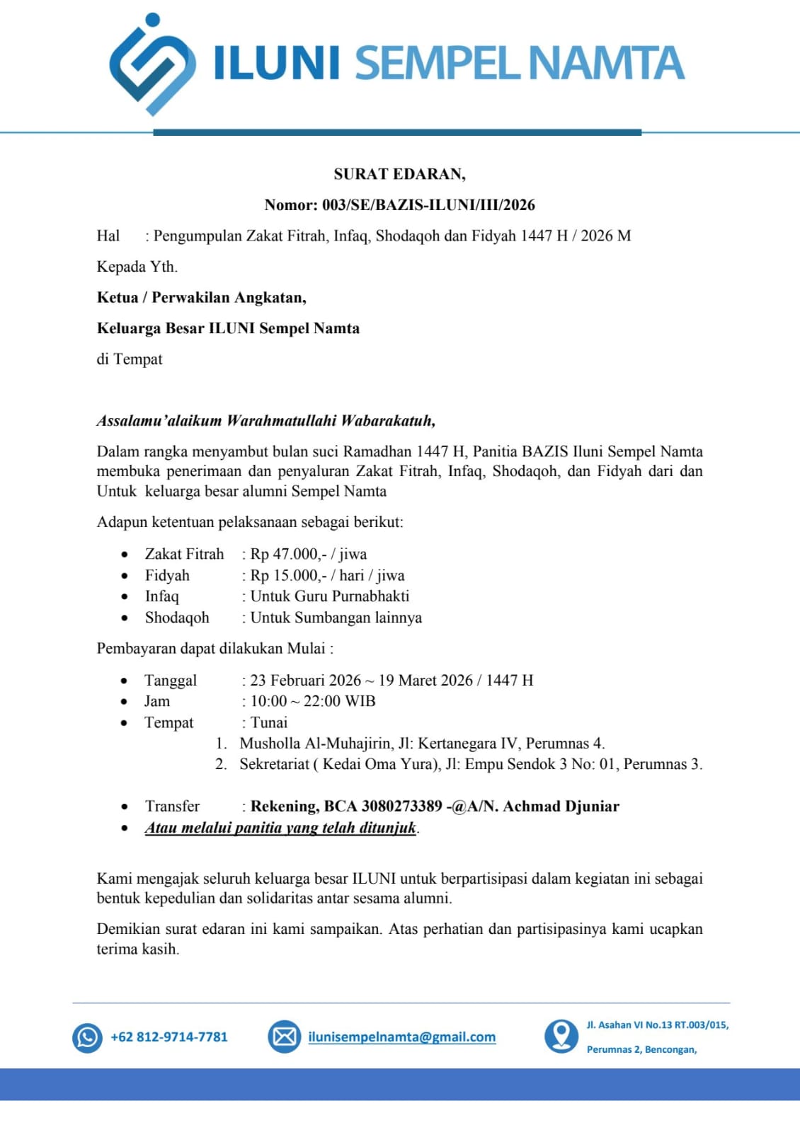 Dalam rangka menyambut bulan suci Ramadhan 1447 Hijriah, Panitia BAZIS Iluni Sempel Namta membuka penerimaan dan penyaluran Zakat Fitrah, Infaq, Shodaqoh, dan Fidyah dari dan untuk keluarga besar Iluni Sempel Namta.