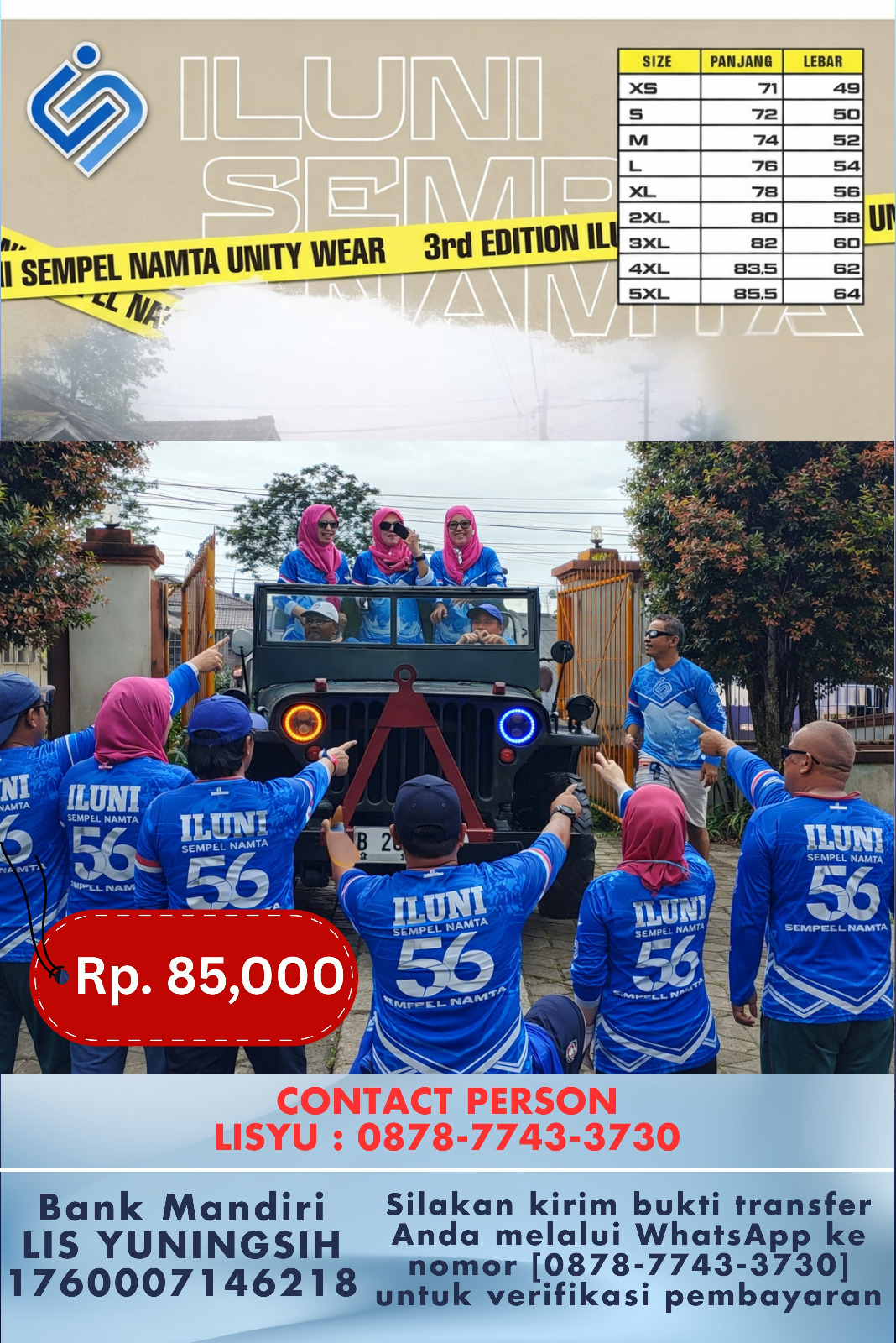Jersey Longsleeve Iluni Sempel Namta dengan desain modern dan warna dinamis, nyaman dipakai untuk aktivitas harian maupun kegiatan komunitas. Bahan ringan, adem, dan fleksibel, cocok untuk jalan santai, olahraga ringan, hingga acara kebersamaan alumni. Tampil kompak, aktif, dan percaya diri. Tersedia dalam berbagai ukuran, untuk pemesanan bisa menghubungi Lisyu di WhatsApp